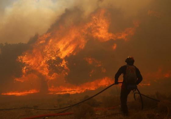 Στις φωτογραφίες του Γιάννη Μπεχράκη για λογαριασμό του Reuters, φαίνεται η τιτάνια προσπάθεια που κατέβαλλε το πυροσβεστικό σώμα προκειμένου να περιορίσει και να θέσει υπό έλεγχο την πύρινη λαίλαπα η οποία «κατέστρεψε σπίτια και έδιωξε κατοίκους από τα σπίτια τους», σύμφωνα με το πρακτορείο.